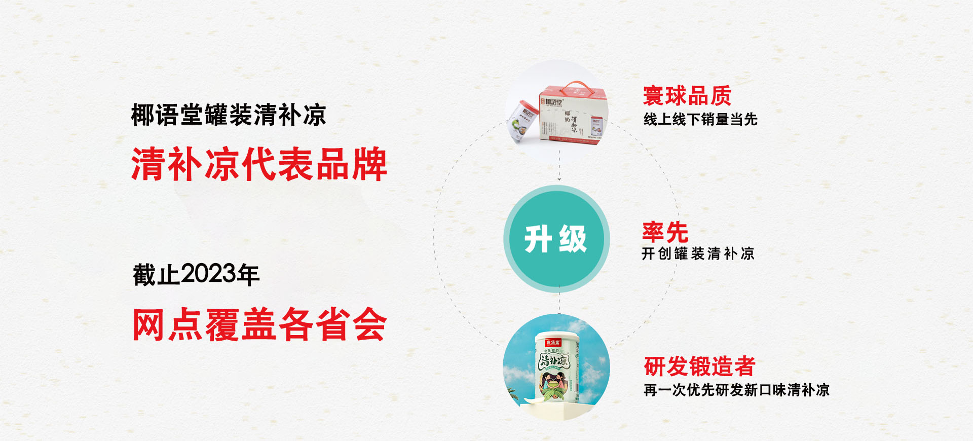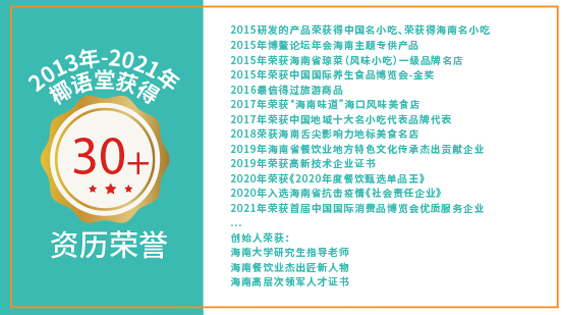 椰語(yǔ)堂公司介紹 椰語(yǔ)堂始創(chuàng)于2012年,是海南一家把海南清補(bǔ)涼為代表的特色小吃精致化、標(biāo)準(zhǔn)化并進(jìn)行連鎖發(fā)展的企業(yè),椰語(yǔ)堂專注于海南本土地域特色元素特別是椰子系列產(chǎn)品的深度研發(fā)。椰語(yǔ)堂被評(píng)為海南風(fēng)味小吃一級(jí)品牌名店,椰語(yǔ)堂多款小吃被評(píng)為海南名小吃、中國(guó)名小吃,并被選為中國(guó)地域十大名小吃代表品牌。椰語(yǔ)堂的全國(guó)門店分布在各高端商場(chǎng)、機(jī)場(chǎng)、郵輪、五星級(jí)酒店、動(dòng)車站、景區(qū)等。椰語(yǔ)堂清補(bǔ)涼被選為博鰲亞洲論壇專供產(chǎn)品、中國(guó)國(guó)際養(yǎng)生食品博覽會(huì)金獎(jiǎng)等殊榮,椰語(yǔ)堂清補(bǔ)涼在線下各連鎖賣場(chǎng)、盒馬鮮生、中石化易捷、中石油昆侖、全國(guó)30多家機(jī)場(chǎng)、五星、七星酒店等渠道銷售并成為政府及集團(tuán)采購(gòu)產(chǎn)品。在電商線上渠道,椰語(yǔ)堂椰奶清補(bǔ)涼無(wú)論在銷量和好評(píng)方面是品類第一,是深受消費(fèi)者喜愛的高品質(zhì)產(chǎn)品。椰語(yǔ)堂是海南大學(xué)食品學(xué)院研究生實(shí)習(xí)基地,公司發(fā)揮椰語(yǔ)堂研究院優(yōu)勢(shì),擁有產(chǎn)品研發(fā)方面的多項(xiàng)專利。椰語(yǔ)堂因?yàn)槠鋬?yōu)秀品質(zhì)及良好顧客體驗(yàn),被中央電視臺(tái)、湖南衛(wèi)視、旅游衛(wèi)視等多家衛(wèi)視、人民日?qǐng)?bào)、中國(guó)縣域經(jīng)濟(jì)報(bào)、新浪、騰訊、SSBD等國(guó)內(nèi)外媒體報(bào)道宣揚(yáng)。椰語(yǔ)堂是海南文化的傳播和弘揚(yáng)者,是海南地標(biāo)美食品牌的優(yōu)秀代表和海南地域文化的一張亮麗名片,同時(shí),椰語(yǔ)堂也是中國(guó)連鎖經(jīng)營(yíng)協(xié)會(huì)會(huì)員單位。 more |